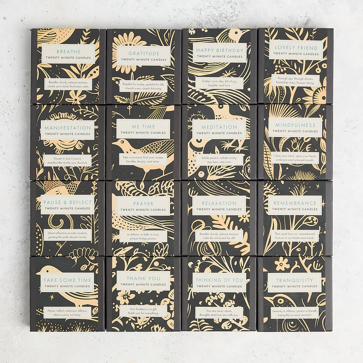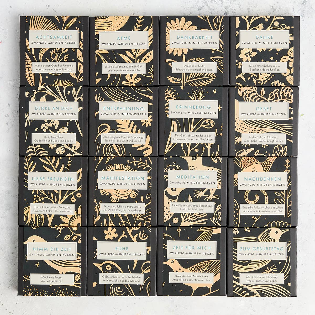 Jede Box enthält 12 x Zwanzig-Minuten-Kerzen und einen Keramikhalter für Entspannung, Meditation, Achtsamkeit und Wohlbefinden. 100% reines Bienenwachs.